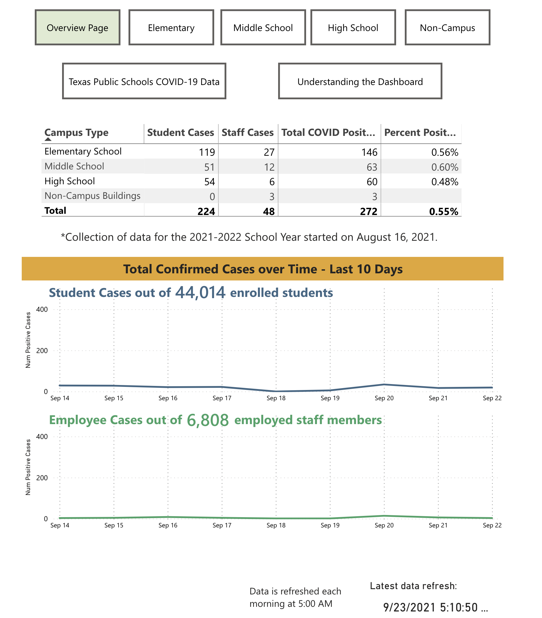 - Each campus has the current positive COVID-19 test amounts shown for the students and employees on that campus. A total Active Case count for the entire campus is also given.