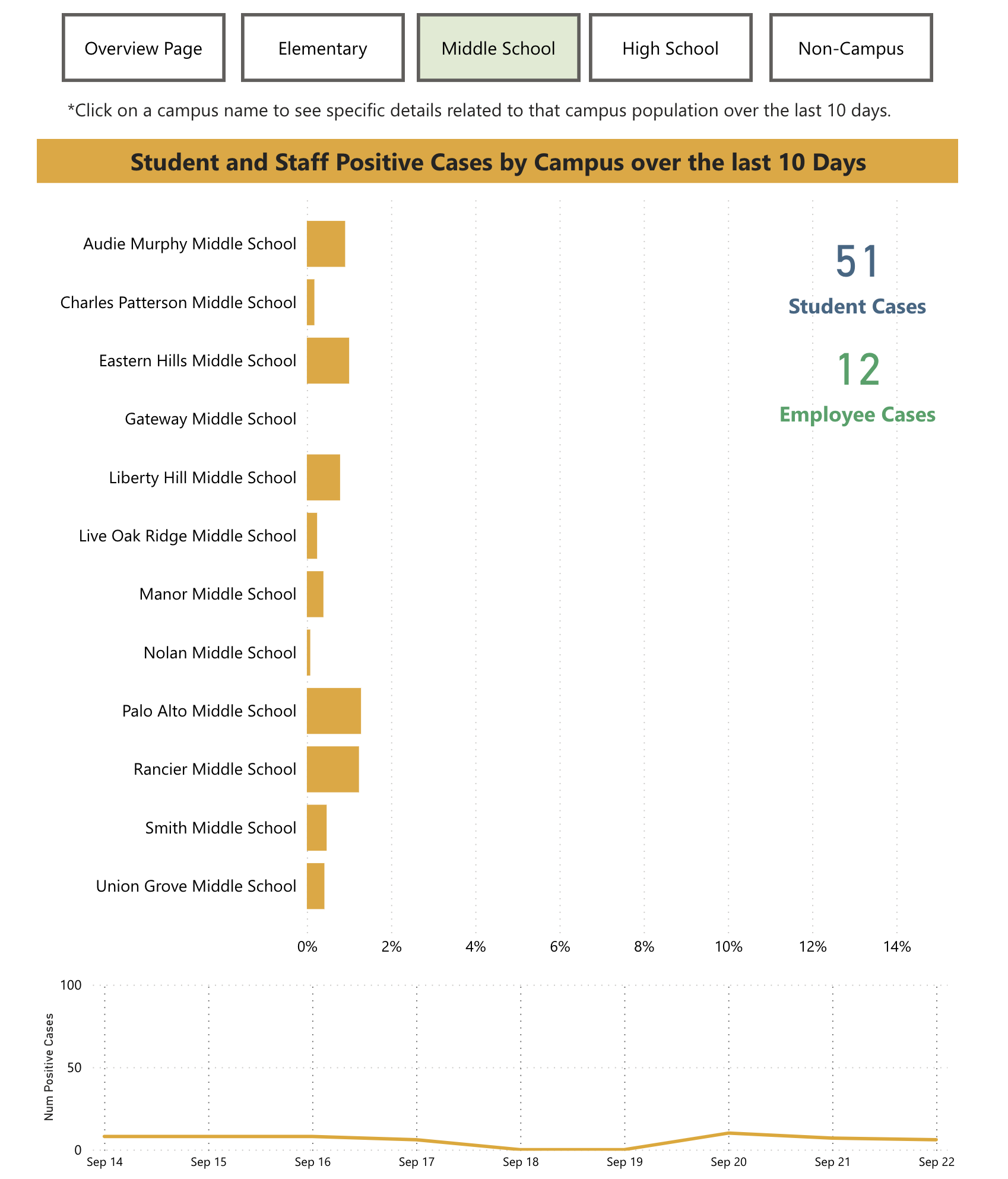 - A timeline of total confirmed cases in the last 10 days is given. Users can filter the timeline by campus if wanted.