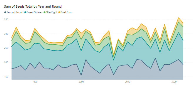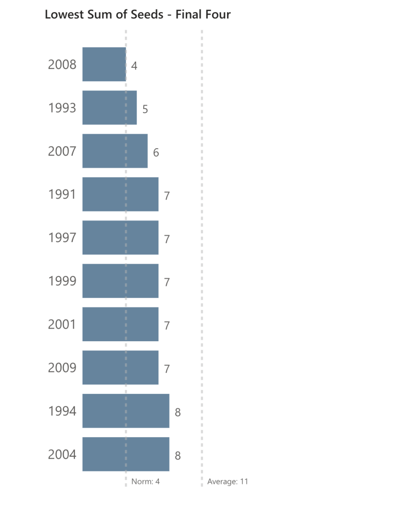 Finally, the Final Four (Norm: 4). As we know, what goes up must come down and that was certainly the case this year. With a Final Four sum of seeds value of 13, 2022 dropped to just above the average and nearly out of the top 10. As mentioned, this is what can happen when a round has a very large sum of seeds: the next round will more than likely trend towards the average as, eventually, the higher seeds start to win. However, that does not always happen, as seen in 2011 which had a relatively average start to the tournament (in terms of sum of seeds) but started to pick up steam in the Elite Eight and Final Four. That year, 11-seed Virginia Commonwealth (VCU) lost to 8-seed Butler in the Final Four while on the other side of the bracket, 3-seed UConn played 4-seed Kentucky. Conversely, we finally have a year that matched the Norm: 2008 found all four 1-seeds making it to the Final Four. This is the one and only time that it has happened since 1985.