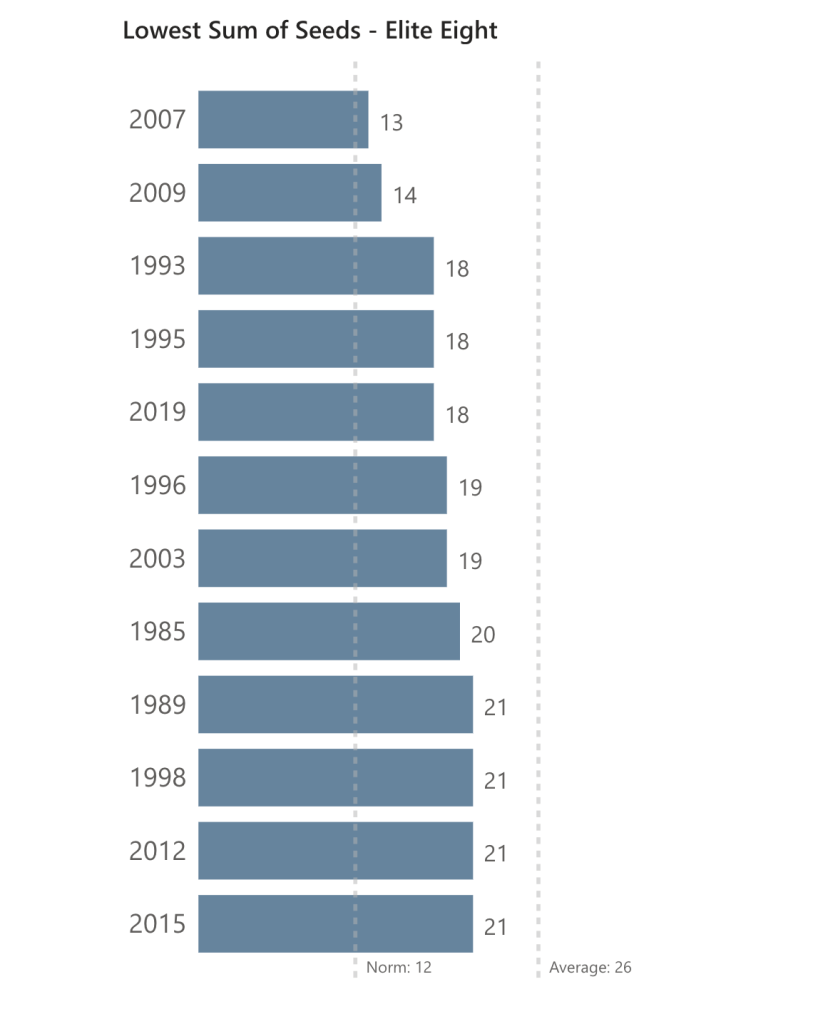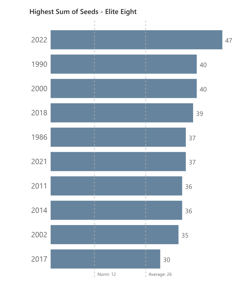 The Elite Eight’s (Norm: 12) sum of seeds was where this year’s madness truly came to light. With a value of 47, seven points higher than the previous highest value, 2022 had the craziest Sweet Sixteen round on record. (Remember: a round’s sum of seeds is indicative of the previous round’s results.) There was only one upset: Saint Peter’s over Purdue, allowing them to become the first 15 seed to make it to the Elite Eight but many other factors came together. First, two out of the three remaining 1 seeds lost. Second, a 10 seed played an 11 seed which has only happened a total of four times (all, coincidentally, in the past decade). And finally, an 8 seed moved onto the Elite Eight which has only happened nine times, North Carolina being two of those nine. It should also be noted that for the first time in this post, we have almost had the Norm in one year: 2007. That year, all 1-seeds, three 2-seeds, and one 3-seed made it to the Elite Eight, making that year one of the most predictable (and not quite so mad) March’s on record.