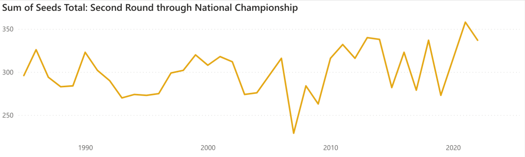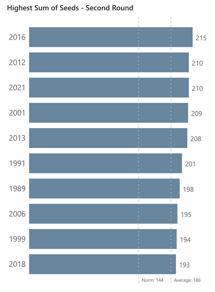 Before we get started, one more advantage of the sum of seeds should be noted. If a round has a large sum of seeds, that implies that the previous round had more lower seeds winning games and a larger number of upsets. With a high sum of seeds, two outcomes occur: first, more upsets which leads to an even larger sum of seeds compared to that round’s Norm and second, with a potentially large delta between the teams playing, more favorites win and so the sum of seeds decreases substantially.