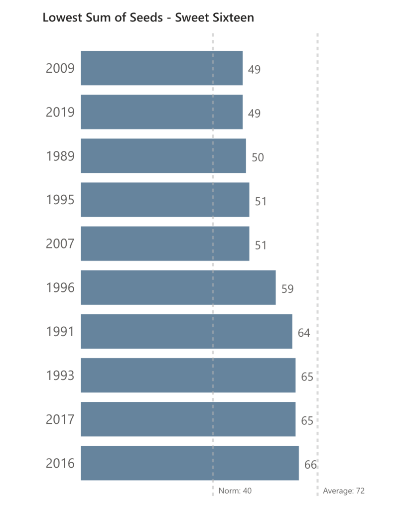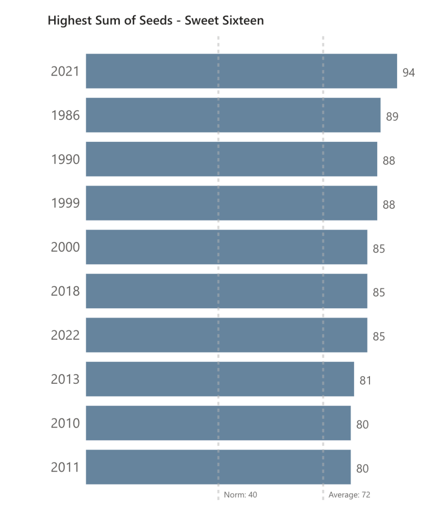 The Sweet Sixteen (Norm: 40) this year had a sum of seeds value of: 85. Note that the percent difference from the Norm and this round is 112.5%. This shows that much more madness occurred during the second round than the first (as the percent difference from the Norm in the second round was only 33.3%). There were five upsets in the second round this year and each one was quite substantial, even if one of them stung a bit. However, even with that amount of tumult, it did not even crack the top five. But two interesting years are 2016 and 2021. These show the dichotomy of what a large Sum of Seeds can result in the following round. First, 2016 had the highest second round Sum of Seeds, as noted above. However, after a majority of favorites won, it had the 10th lowest value in the Sweet Sixteen. Contrast that to 2021, which had the third highest Sum of Seeds in the second round, and after a number of upsets that round, ended up with the highest value in the Sweet Sixteen by a substantial margin.