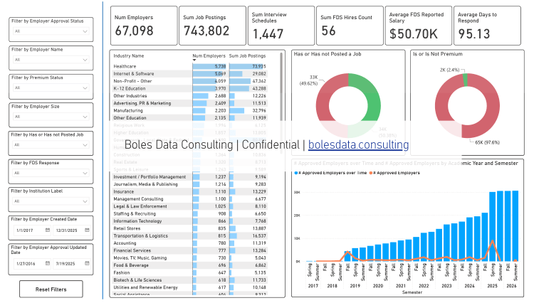This dashboard was built to give career centers instant insights into employer activity, job postings, events, and engagement across Handshake. It’s designed to help staff understand which employers are actively connecting with students—and which aren’t.